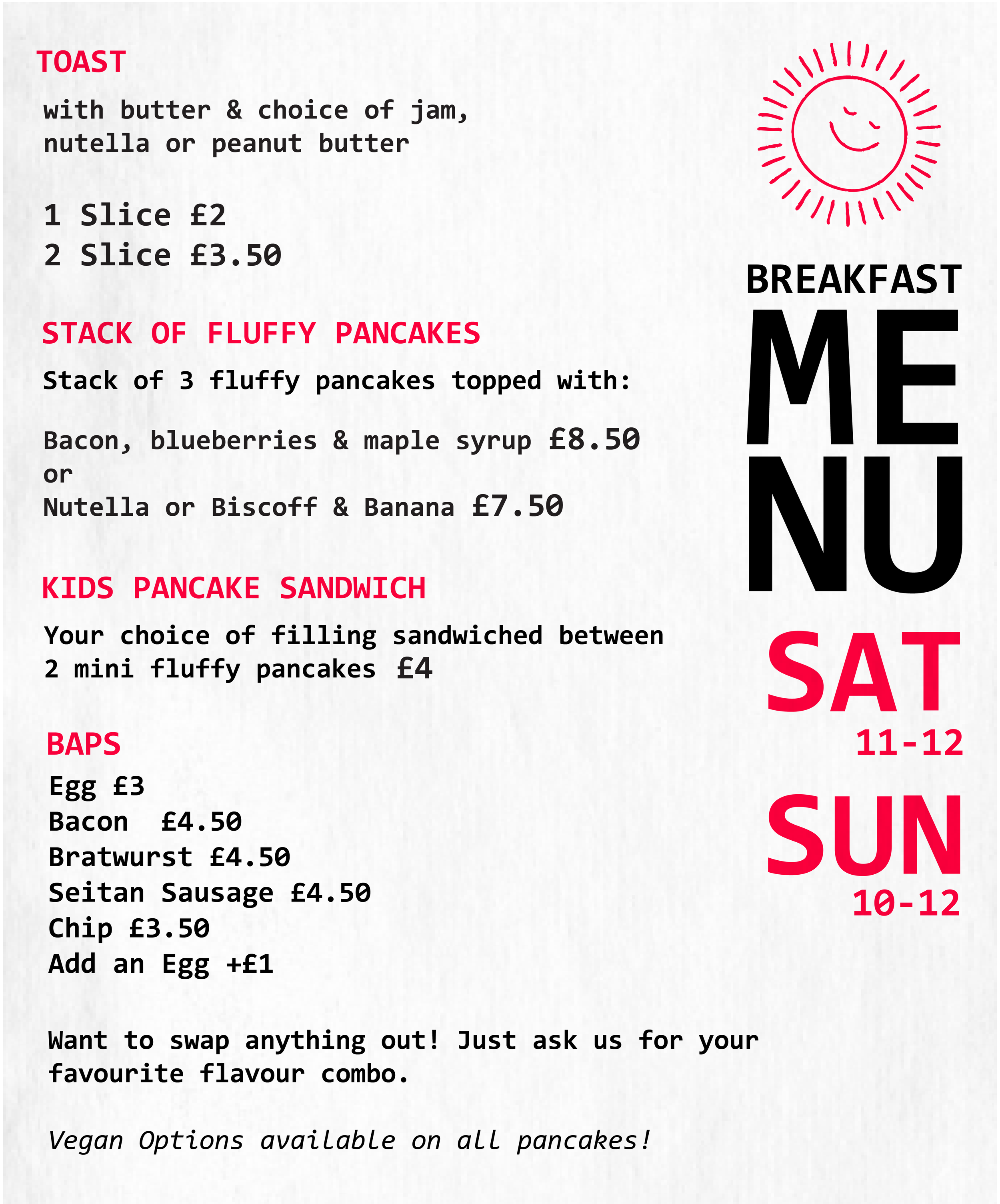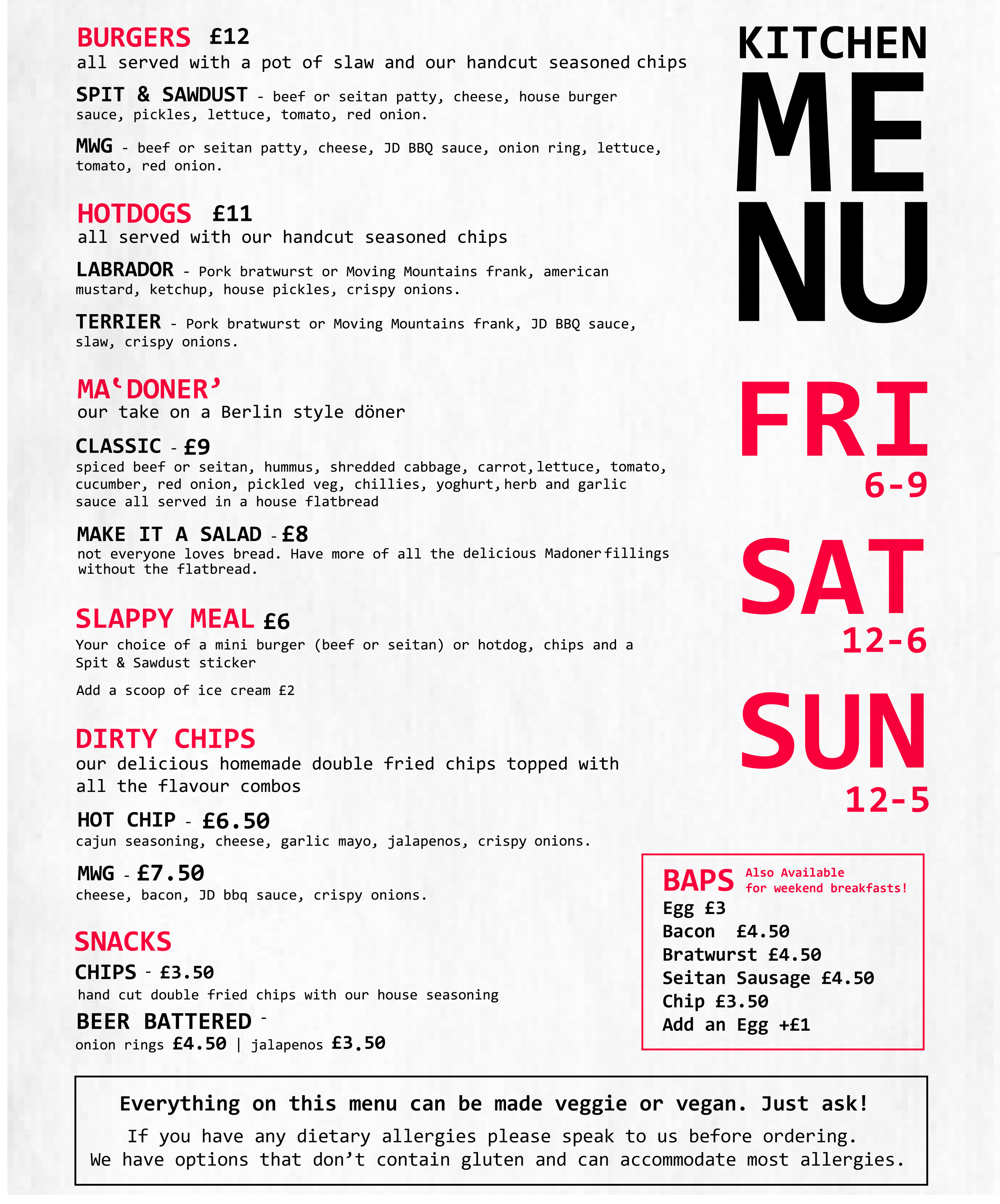 We serve burgers, sides, breakfast baps, cakes and drinks from our little cafe at Spit & Sawdust. Everything is made by us, we source as much of our ingredients as possible from local suppliers, and all our meat, eggs and milk are organic. For special occasions we fire up our outside pizza oven and can cater for events both here and offsite. We have a full licence with a couple of beers on tap, bottled cider and beers, a small but perfectly formed wine list and a selection of spirits and spritz.