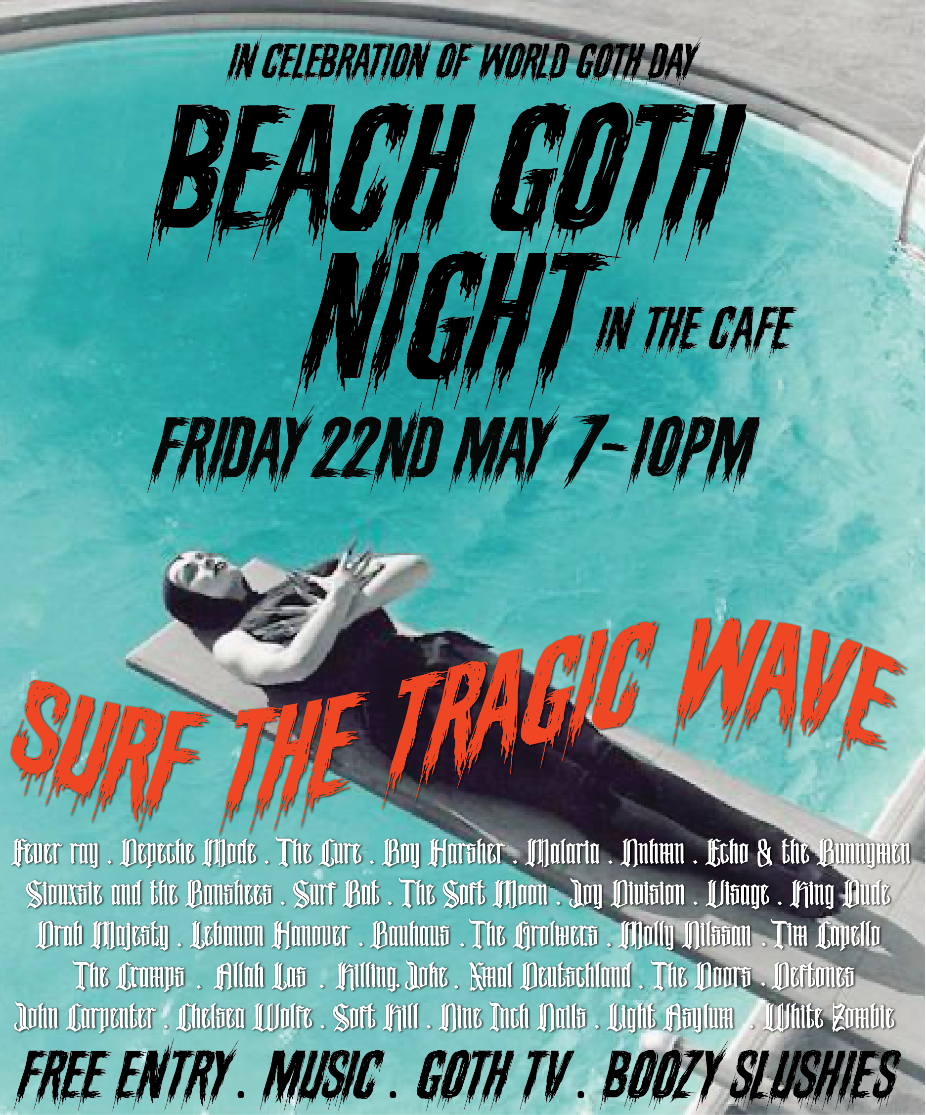 It’s world goth day on May 22nd! To celebrate marlborough witch & graveyard tramp will be co curating a soundtrack to die for - playing from 7-10pm in the cafe with gothy TV visuals to accompany the mood. We will be slinging frozen boozy slushies on the bar and creating the summer beach X goth cross over you never knew you needed!