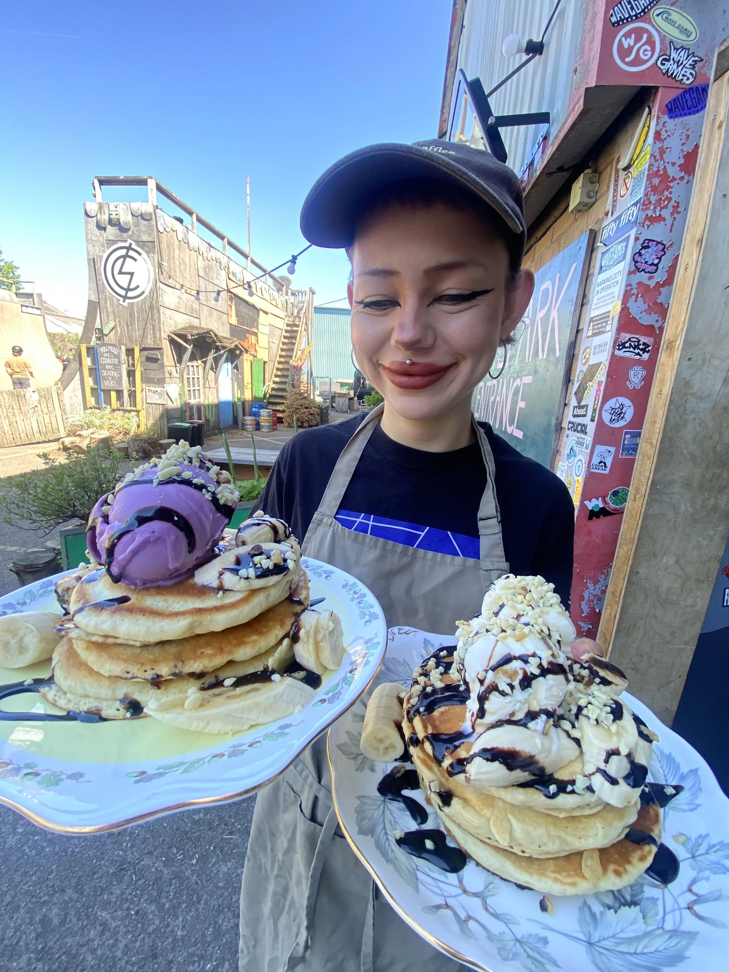 She’s showing off our banana, chopped nuts, chocolate sauce and ice cream ones. Both served with a scoop of Joe’s ice cream. Berry sorbet & Vanilla - you can choose your flavour.