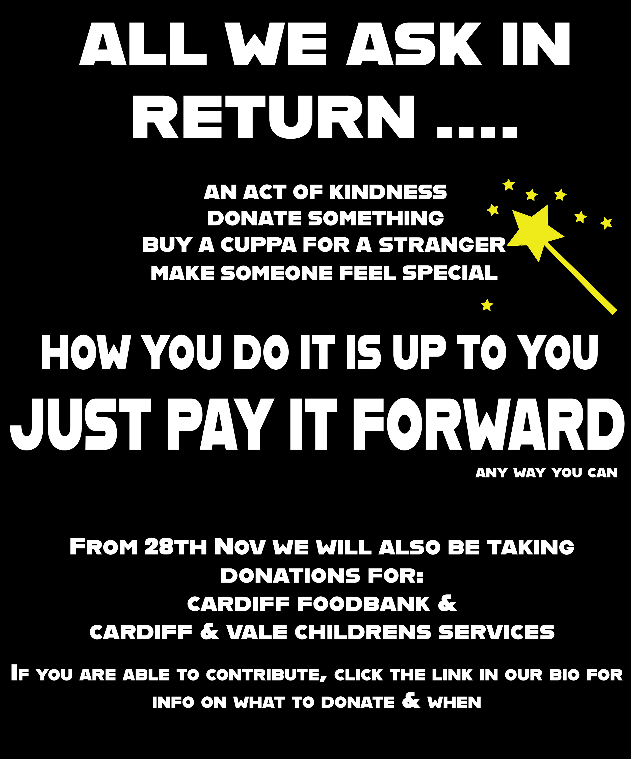 Starting on November 28th (official Black Friday … when it wasn’t a whole month!), We will be collecting donations for Cardiff Food Bank & Cardiff & Vale Children’s Services.